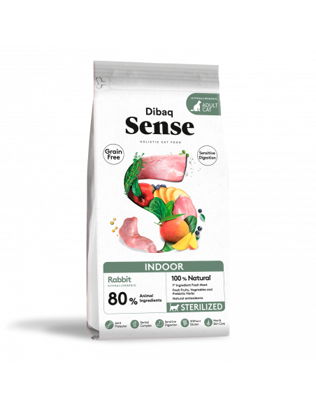 Dibaq Sense Grain Free Indoor El Dibaq Sense Grain Free Indoor es un pienso completo e hipoalergénico sin cereales, especialmente formulado para gatos adultos de interior. Este alimento combina conejo fresco (35 %) y pavo deshidratado ( 34 %) como fuentes de proteína ligera y altamente digestible. Además, incluye extractos naturales como raíz de achicoria (inulina-FOS) y levaduras (MOS) para favorecer el tránsito digestivo, y un complejo dental (jengibre y ortiga) junto con extracto de yuca que ayudan a controlar los olores y la formación de bolas de pelo.