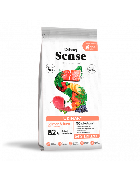 Dibaq Sense Grain Free Urinary es un pienso completo e hipoalergénico sin cereales, especialmente formulado para gatos adultos con sensibilidad urinaria o esterilizados. Este alimento combina salmón fresco y atún fresco como fuentes de proteína de alta calidad, garantizando una digestión óptima. Además, incluye un complejo urinario específico que ayuda a mantener un trato urinario saludable y reduce el riesgo de formación de cristales. También incorpora frutas, verduras y antioxidantes naturales que refuerzan el sistema inmunitario.